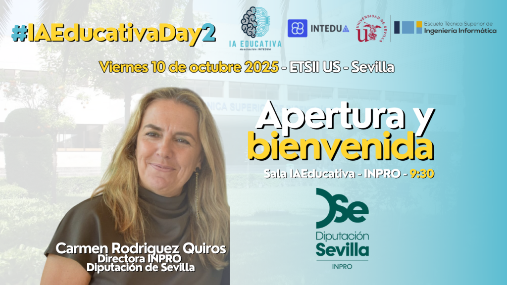Contaremos en el próximo #IAEducativaDay2 con la colaboración de INPRO Diputación de Sevilla, que nos acompañan durante el evento y participan de forma activa, a través de su Directora Carmen Rodriguez Quiros en la apertura de la misma.