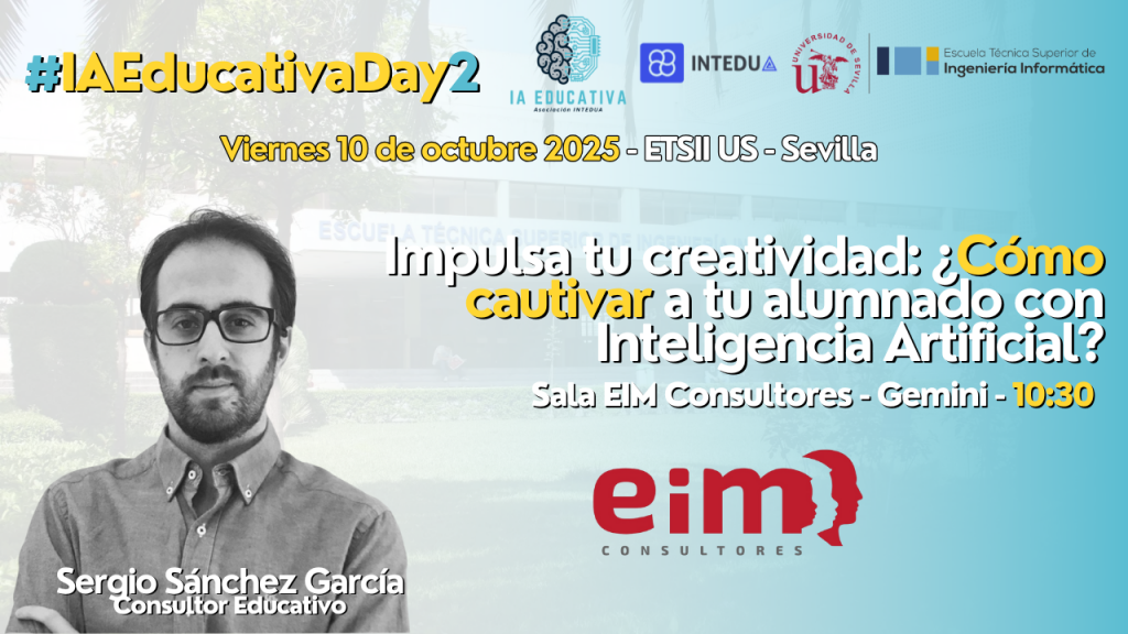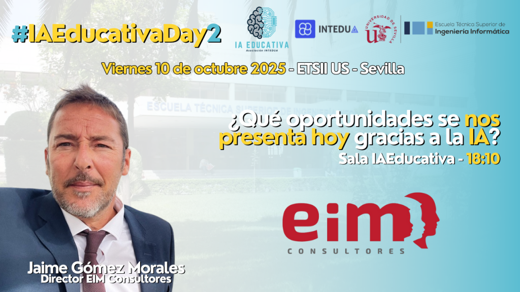 En esta ocasión, tenemos la inmensa suerte de confirmar la participación del Equipo de EIM Consultores en el #IAEducativaDay2 del 10 de octubre, en la ETSII de la Universidad de Sevilla.