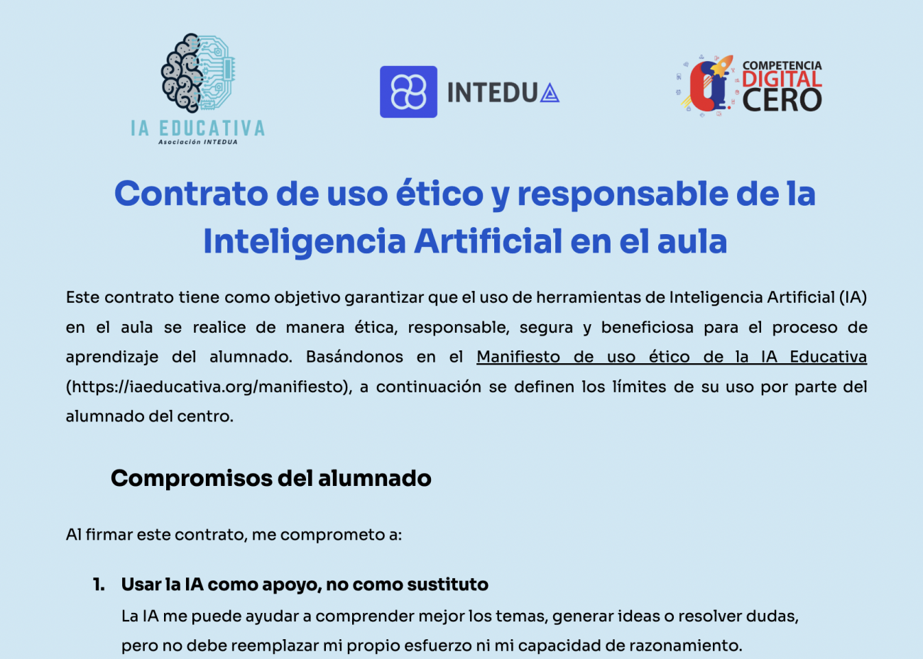 Este contrato tiene como objetivo garantizar que el uso de herramientas de Inteligencia Artificial (IA) en el aula se realice de manera ética, responsable, segura y beneficiosa para el proceso de aprendizaje del alumnado. Basándonos en el Manifiesto de uso ético de la IA Educativa (https://iaeducativa.org/manifiesto), a continuación se definen los límites de su uso por parte del alumnado del centro.