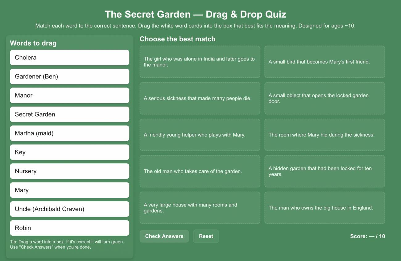 Match each word to the correct sentence. Drag the white word cards into the box that best fits the meaning. Designed for ages ~10.