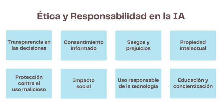 Para mencionar algunos puntos a tener en cuenta sobre cómo ser ético y responsable al hacer uso de estas tecnologías inteligentes, se puede citar la transparencia en la toma de decisiones, ya que es necesario entender cómo procesan y llegan a los resultados que presentan; el consentimiento informado, en que todos los usuarios necesitan estar plenamente advertidos de las condiciones de uso, es decir, qué usos se harán de los datos y cuáles son los deberes y derechos asociados a los involucrados en todas las etapas de este proceso.