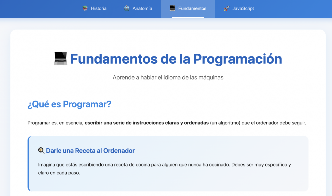 Este recurso es un entorno educativo interactivo que integra, en un solo espacio, la historia de la computación, la anatomía del ordenador, los fundamentos de la programación y una introducción práctica a JavaScript. Por medio de línea del tiempo, explicaciones paso a paso, ejemplos comentados, ejecución simulada de código y preguntas de opción múltiple, el recurso favorece un aprendizaje progresivo, autónomo y accesible para quienes dan sus primeros pasos en el mundo de la programación.